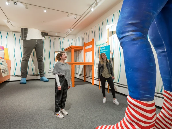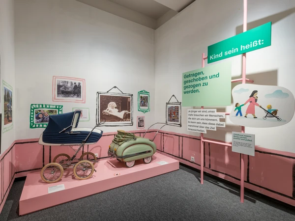 Die Ausstellung gestaltete sich als abwechslungsreiche Reise. Sie führte uns von den kindlichen Entwicklungsstufen zu den Fragen: Wie lange ist man eigentlich Kind? Ab wann fühlt man sich erwachsen? Im Spannungsfeld Familie und Gesellschaft ist es nötig, das Kindsein immer wieder neu zu verhandeln. Miteinander reden und sich generationenübergreifend verstehen – darauf lag ein Fokus dieser Ausstellung.